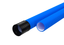 Den blå yderside er korrugeret for ekstra styrke, mens den sorte inderside er glat for at sikre god vandgennemstrømning. Drænrøret er fuldperforeret med små huller (1,2 x 10,1 mm), så vand hurtigt kan trænge ind. Det er testet til tæthed på ≥ 0,5 bar og kan bruges uden tekstilfilter, hvilket giver en enkel løsning uden ekstra materialer.