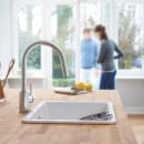 Dette køkkenarmatur i børstet stål er designet til at gøre arbejdet ved vasken nemmere og mere effektivt. Med et højt, C-formet udløb og en udtrækstud med to stråletyper får du fleksibilitet til både rengøring, skylning og fyldning af store gryder.