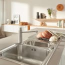 Denne køkkenvask i rustfrit stål er udviklet til dig, der ønsker ekstra fleksibilitet og funktionalitet i køkkenet. Med en stor kumme, en ekstra halvkumme og en integreret afløbsbakke får du masser af plads til både opvask og afdrypning af gryder og køkkenredskaber.