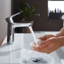 Vi kender alle til udfordringerne, som kalk kan skabe i badevÊrelset. Takket vÊre Quick Clean-funktionen pÄ Talis E armaturet, kan du let og hurtigt fjerne kalkaflejringer fra perlatoren ved blot at gnide med din finger. Dette gÞr vedligeholdelsen bÄde enkel og tidsbesparende, sÄ du kan bruge din tid pÄ noget mere interessant end kalkfjerning.