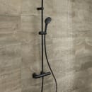 Den mat sorte PVD-overflade beskytter mod slid og gør rengøringen nem. Gummidyser på begge brusere betyder, at kalk let kan fjernes med en finger, så dit brusesæt holder sig pænt længere. Termostaten har sikkerhedsspærre ved 40 °C, så du undgår pludselige temperaturudsving.