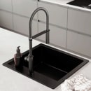 Vasken er fremstillet i granitkomposit, som er kendt for at være robust over for ridser og varme. Den matte, sorte overflade er UV-resistent og nem at holde ren, så vasken bevarer sit flotte udseende i mange år. Med et integreret hanehul er det let at montere armaturet, og du kan vælge mellem nedfældning eller underlimning, alt efter hvad der passer bedst til dit køkken.